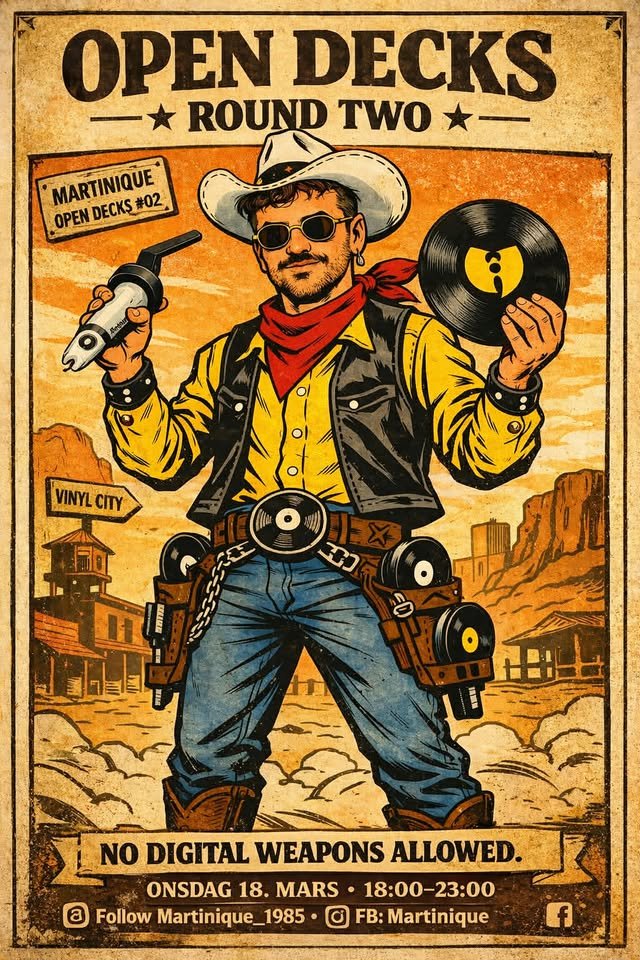 Dette er som open mic — bare for vinyl. Du trenger ikke være DJ. Ta med platene du spiller hjemme og del 30 minutter med musikk du elsker. Alt er lov: hip-hop, funk, jazz, rock, soul, rare funn, soundtracks, guilty pleasures — så lenge det er vinyl only.